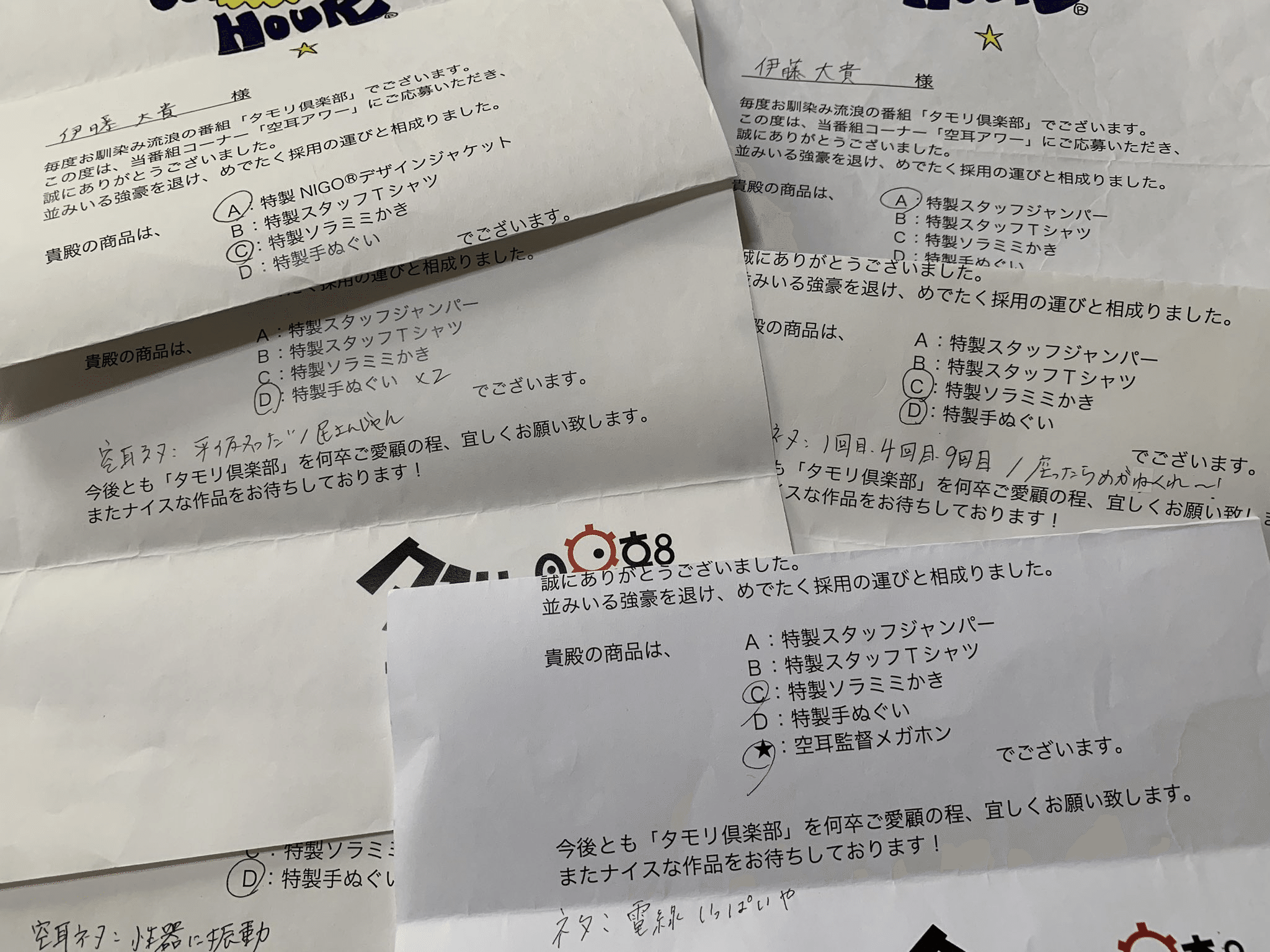 僕は、かつて『タモリ倶楽部』の人気コーナー「空耳アワー」で常連投稿者として活動していました。全賞品(手ぬぐい、ミミかき、Tシャツ、ジャンパー、メガホン)をコンプリートしており、しかもジャンパーはなんと2着も獲得しています。