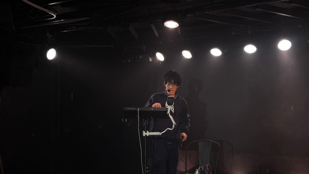 シンセサイザーやグルーヴボックスといった電子楽器を演奏しながら、人間の私がボーカロイドの知声、めろうと共に原口沙輔氏の「ユレ弧」と「空気」の2曲を歌う、というライブパフォーマンスです。ちなみにスマートフォンから出力しているボーカロイドの声は音量等のみを調整した、いわば素の音で、他の音はほぼ全部画面に映っている電子機材から鳴っています。